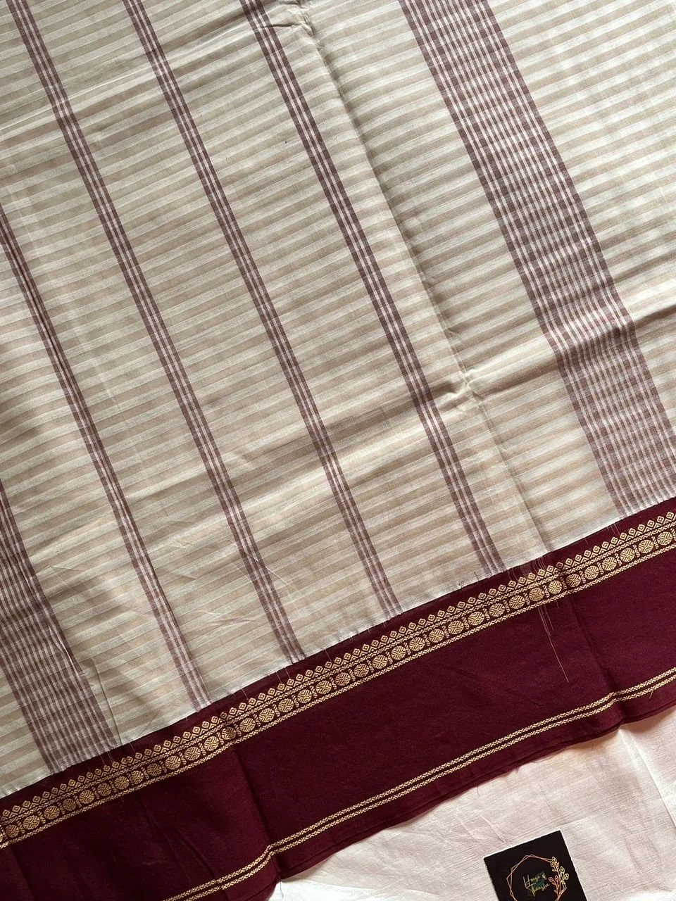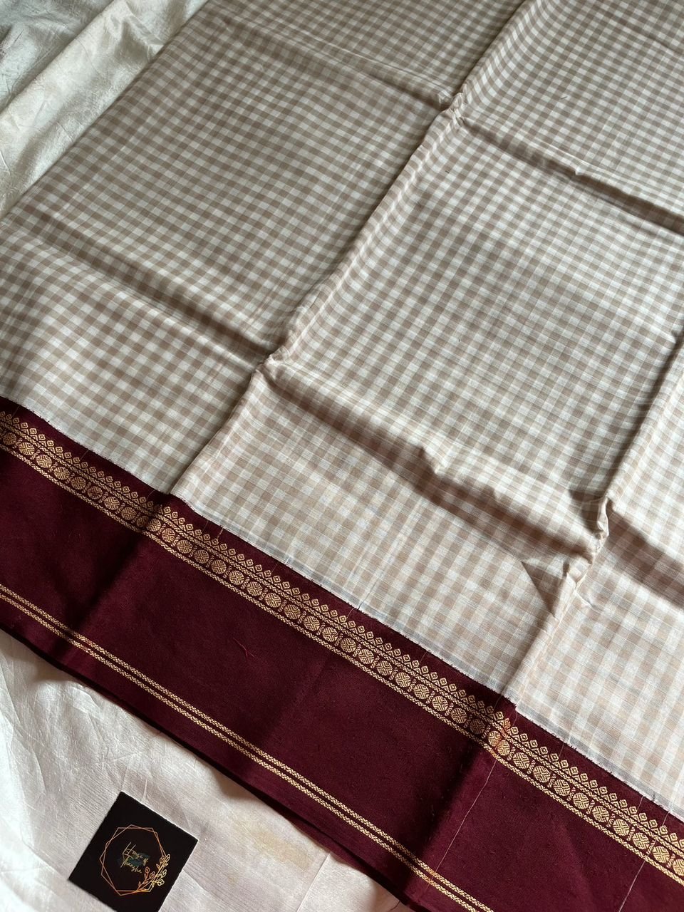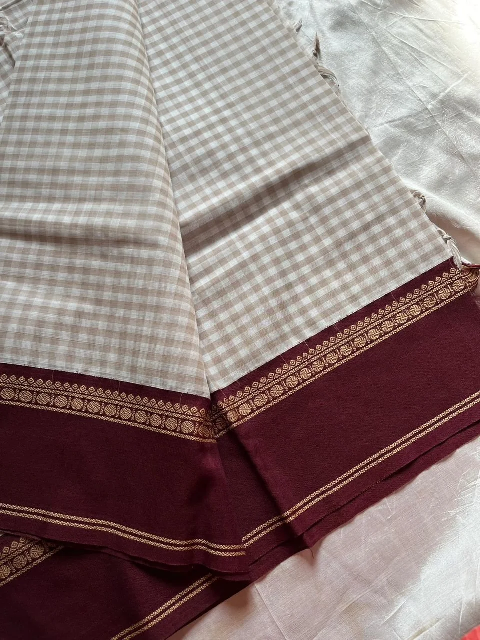 Design: Fine white and beige block checks, rich maroon Korvai border